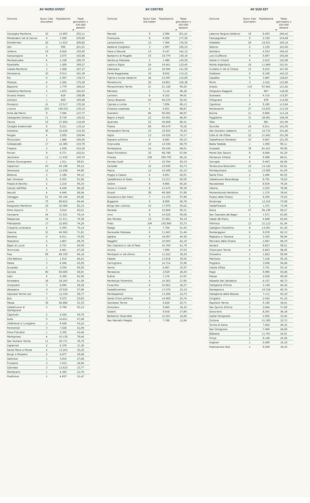 I comuni sono suddivisi per ASL e ordinati in base al tasso di nuovi positivi ogni 100mila abitanti in modo da porre subito l’attenzione delle stesse ASL, ospedali e comuni per i territori che riportano un significativo aumento dei casi.