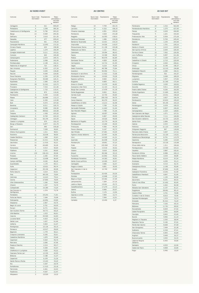 I comuni sono suddivisi per ASL e ordinati in base al tasso di nuovi positivi ogni 100mila abitanti in modo da porre subito l’attenzione delle stesse ASL, ospedali e comuni per i territori che riportano un significativo aumento dei casi.