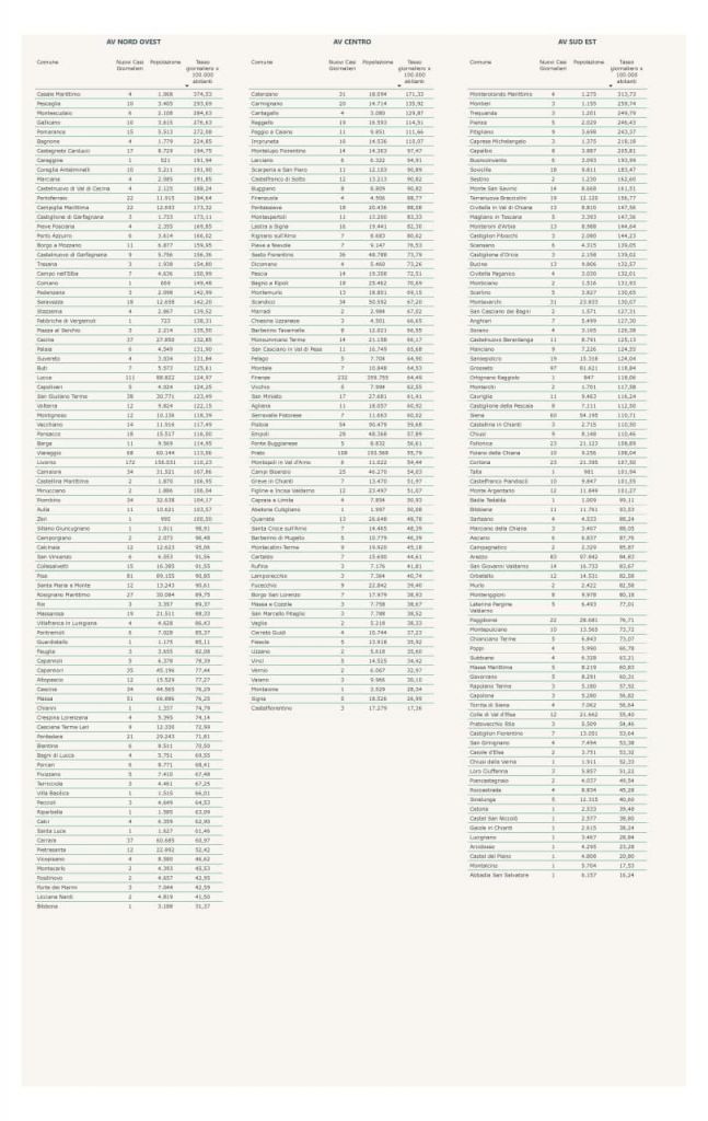 I comuni sono suddivisi per ASL e ordinati in base al tasso di nuovi positivi ogni 100mila abitanti in modo da porre subito l’attenzione delle stesse ASL, ospedali e comuni per i territori che riportano un significativo aumento dei casi.