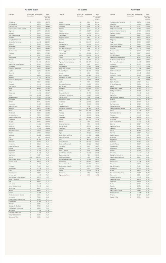 I comuni sono suddivisi per ASL e ordinati in base al tasso di nuovi positivi ogni 100mila abitanti in modo da porre subito l’attenzione delle stesse ASL, ospedali e comuni per i territori che riportano un significativo aumento dei casi.