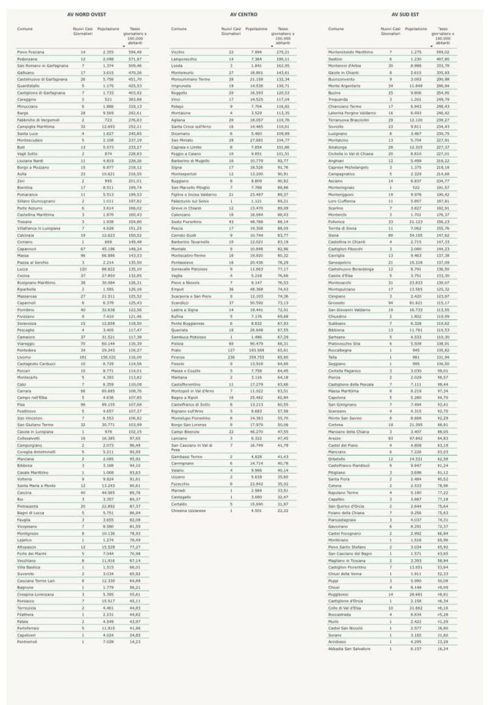 I comuni sono suddivisi per ASL e ordinati in base al tasso di nuovi positivi ogni 100mila abitanti in modo da porre subito l’attenzione delle stesse ASL, ospedali e comuni per i territori che riportano un significativo aumento dei casi.