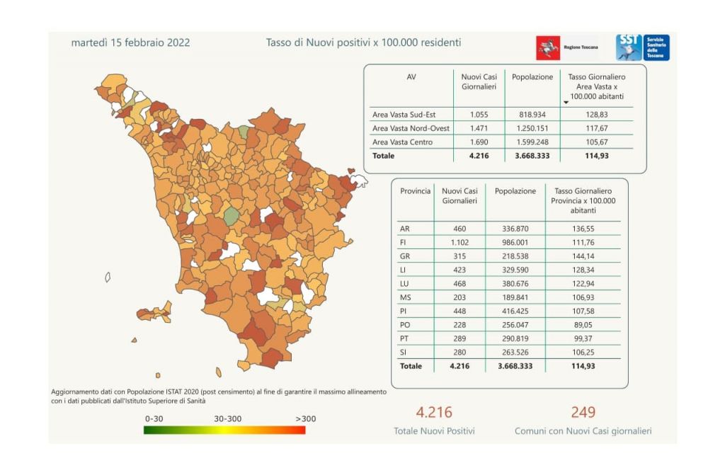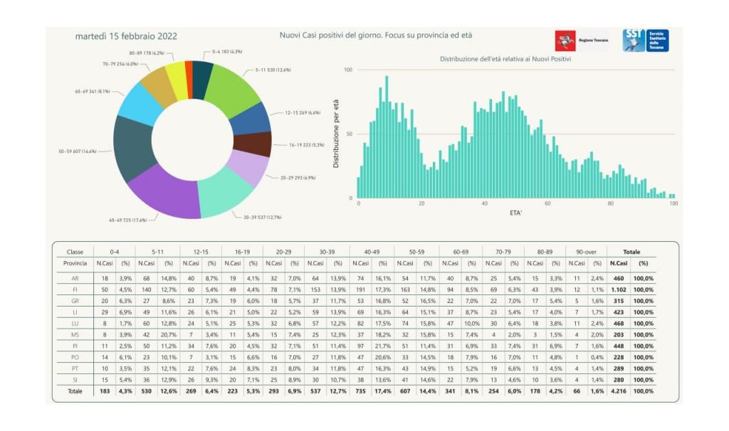 I nuovi casi registrati in Toscana sono 4.216 su 43.440 test di cui 9.929 tamponi molecolari e 33.511 test rapidi. Il tasso dei nuovi positivi è 9,71% (58,7% sulle prime diagnosi).