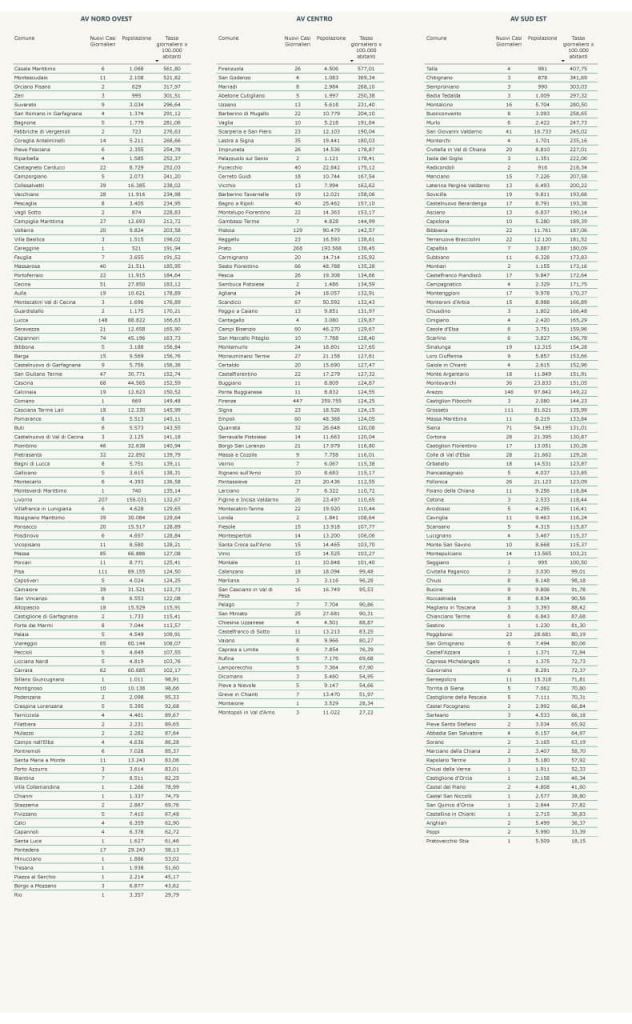 I comuni sono suddivisi per ASL e ordinati in base al tasso di nuovi positivi ogni 100mila abitanti in modo da porre subito l’attenzione delle stesse ASL, ospedali e comuni per i territori che riportano un significativo aumento dei casi.