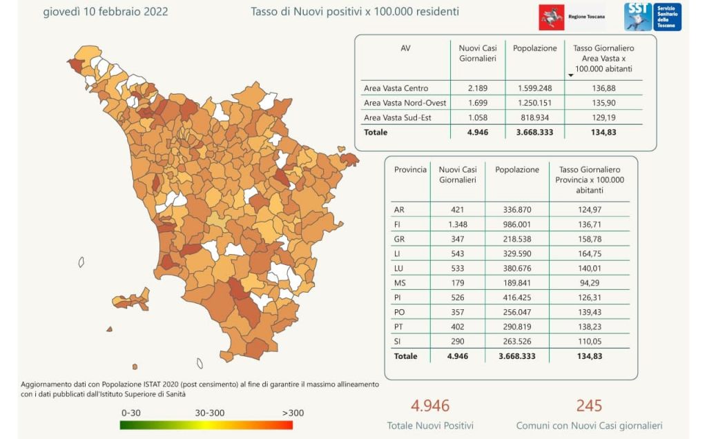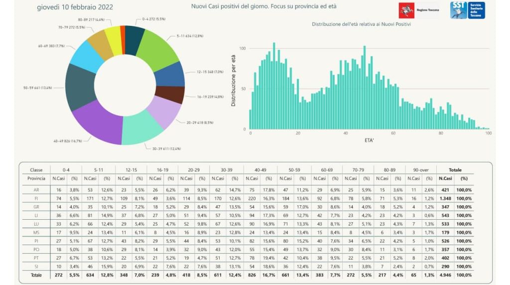 I nuovi casi registrati in Toscana sono 4.946 su 45.253 test di cui 12.891 tamponi molecolari e 32.362 test rapidi. Il tasso dei nuovi positivi è 10,93% (59,7% sulle prime diagnosi)