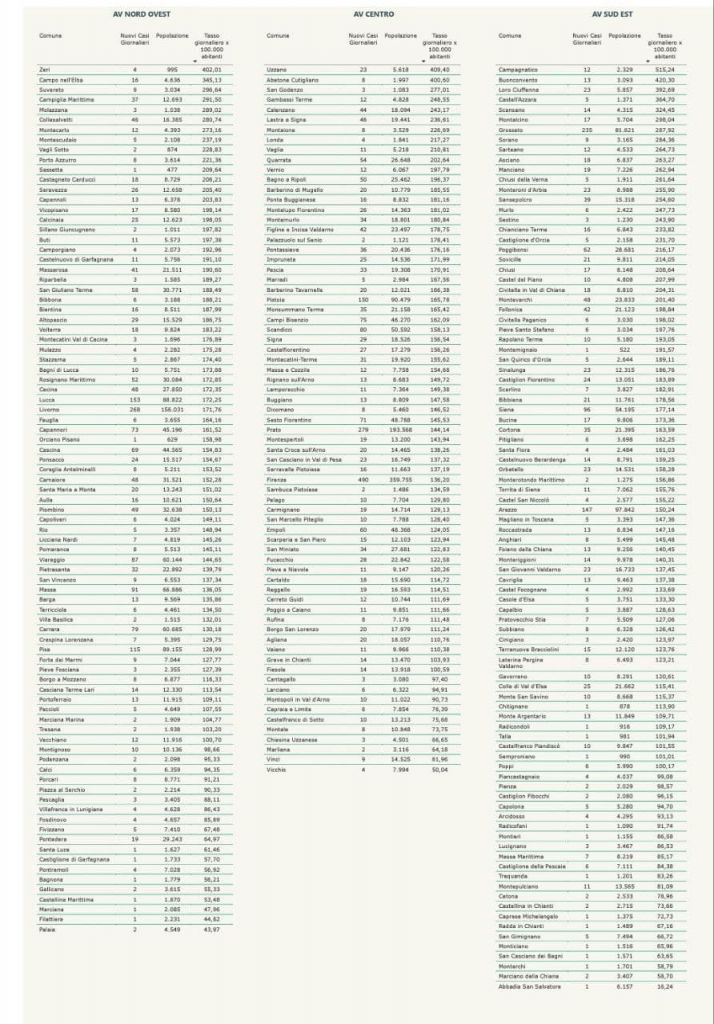 I comuni sono suddivisi per ASL e ordinati in base al tasso di nuovi positivi ogni 100mila abitanti in modo da porre subito l’attenzione delle stesse ASL, ospedali e comuni per i territori che riportano un significativo aumento dei casi.