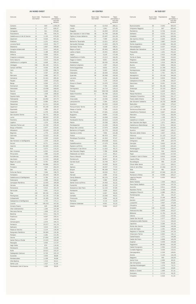 I comuni sono suddivisi per ASL e ordinati in base al tasso di nuovi positivi ogni 100mila abitanti in modo da porre subito l’attenzione delle stesse ASL, ospedali e comuni per i territori che riportano un significativo aumento dei casi.