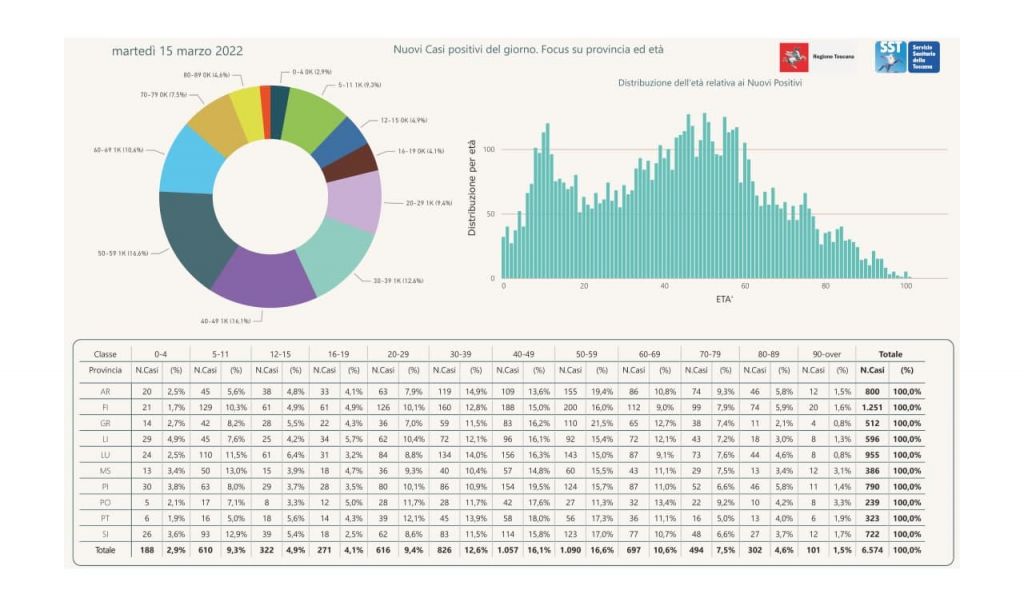 I nuovi casi registrati in Toscana sono 6.574 su 39.824 test di cui 8.178 tamponi molecolari e 31.646 test rapidi. Il tasso dei nuovi positivi è 16,51% (66,5% sulle prime diagnosi).