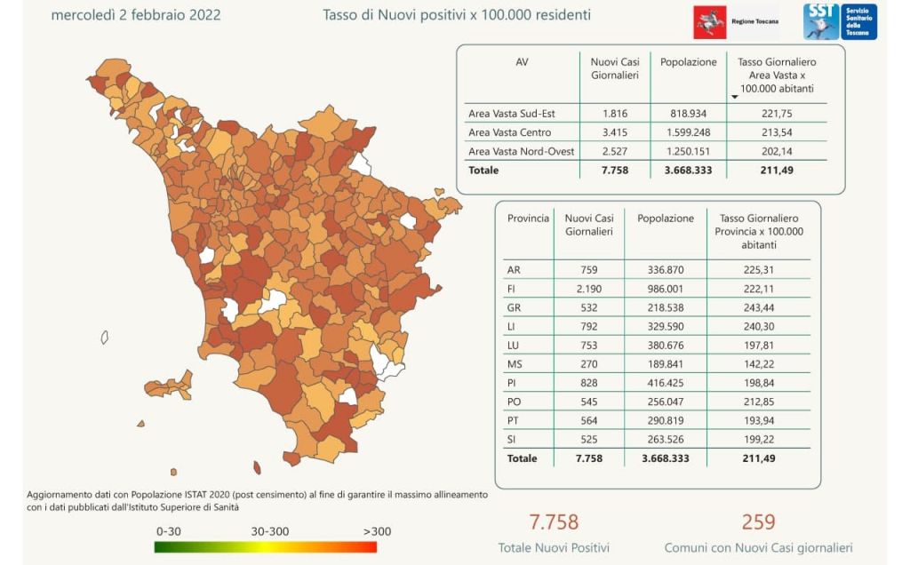 In Toscana sono 756.941 i casi di positività al Coronavirus, 7.758 in più rispetto a ieri (2.896 confermati con tampone molecolare e 4.862 da test rapido antigenico).