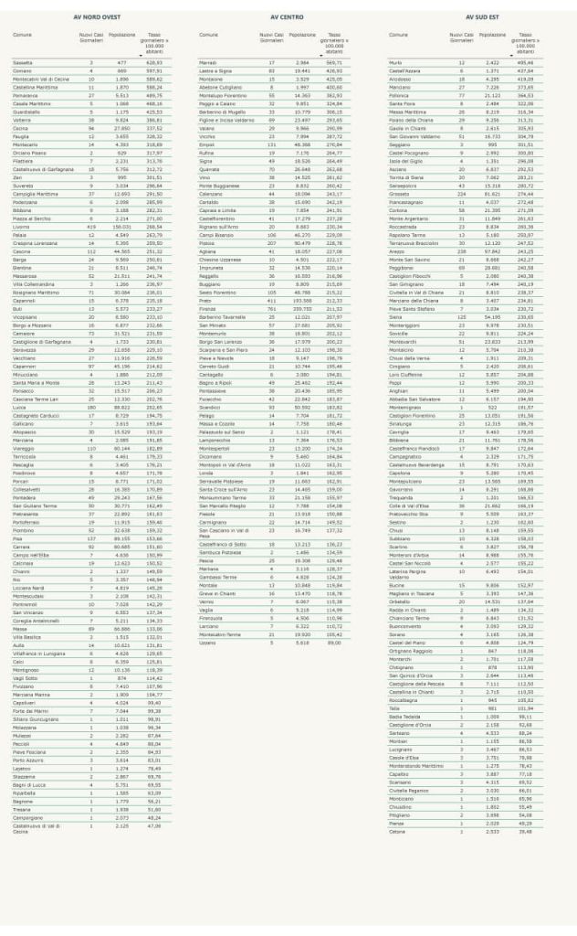 I comuni sono suddivisi per ASL e ordinati in base al tasso di nuovi positivi ogni 100mila abitanti in modo da porre subito l’attenzione delle stesse ASL, ospedali e comuni per i territori che riportano un significativo aumento dei casi.