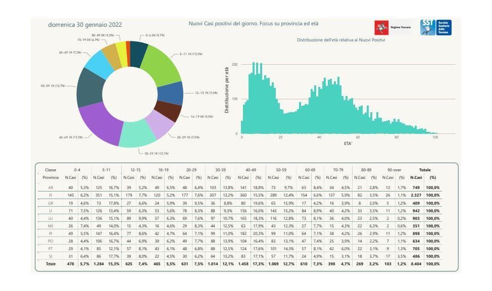 I nuovi casi registrati in Toscana sono 8.404 su 65.658 test di cui 19.410 tamponi molecolari e 46.248 test rapidi. Il tasso dei nuovi positivi è 12,80% (66,7% sulle prime diagnosi).
