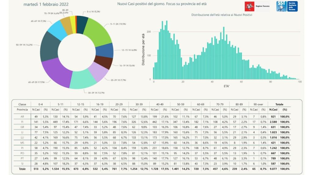 I nuovi casi registrati in Toscana sono 9.877 su 85.181 test di cui 15.552 tamponi molecolari e 69.629 test rapidi. Il tasso dei nuovi positivi è 11,60% (73,0% sulle prime diagnosi).