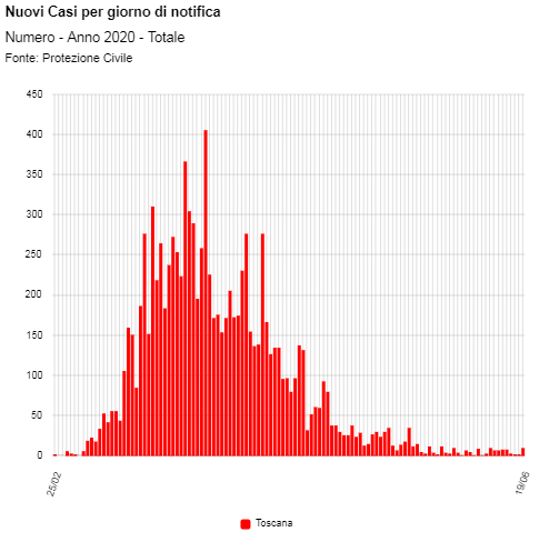 La Toscana si conferma al 10° posto in Italia come numerosità di casi, con circa 274 casi per 100.000 abitanti (media italiana circa 395 x100.000, dato di ieri).