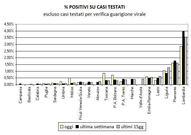 Eccetto tre regioni del Nord Ovest dove permangono alcune criticità: oltre al Piemonte e alla Liguria è ancora la Lombardia, dove la percentuale di nuovi casi sui tamponi effettuati arriva al 4% in quest’ultima settimana (la Toscana è allo 0,33%), a sostenere in media il 70% delle nuove diagnosi giornaliere.