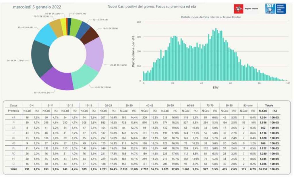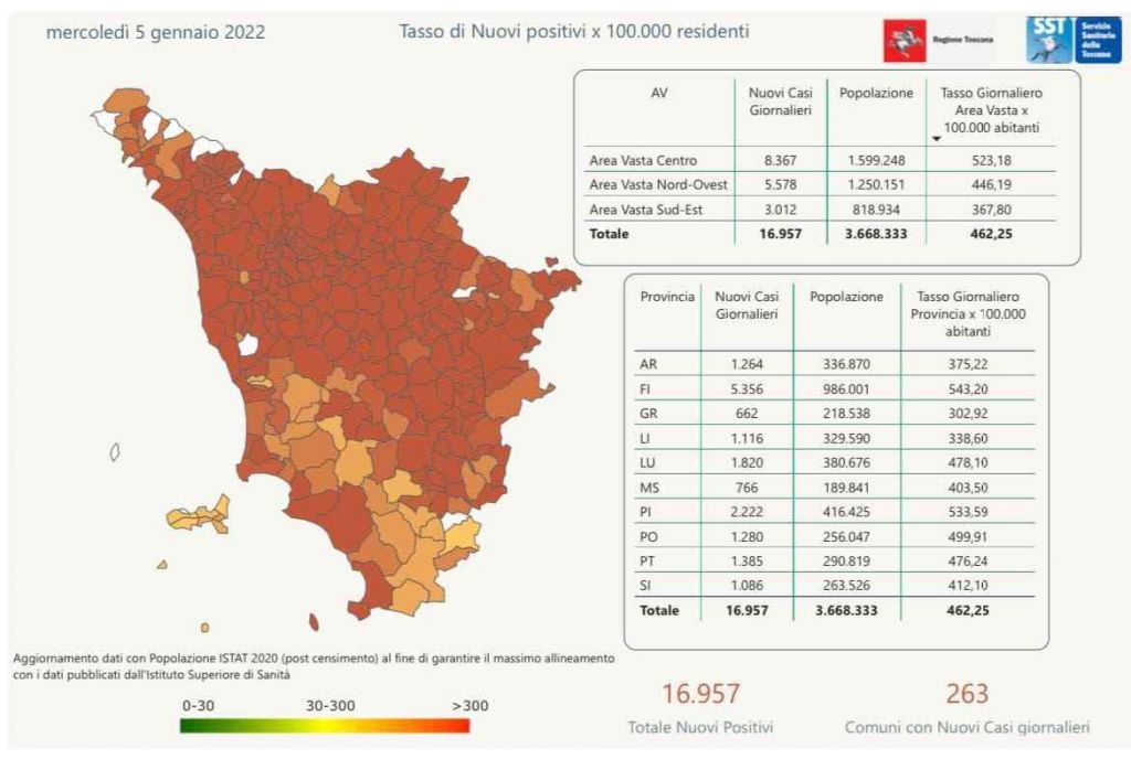 I nuovi casi registrati in Toscana sono 16.957 su 67.310 test di cui 21.680 tamponi molecolari e 45.630 test rapidi. Il tasso dei nuovi positivi è 25,19% (74,6% sulle prime diagnosi).