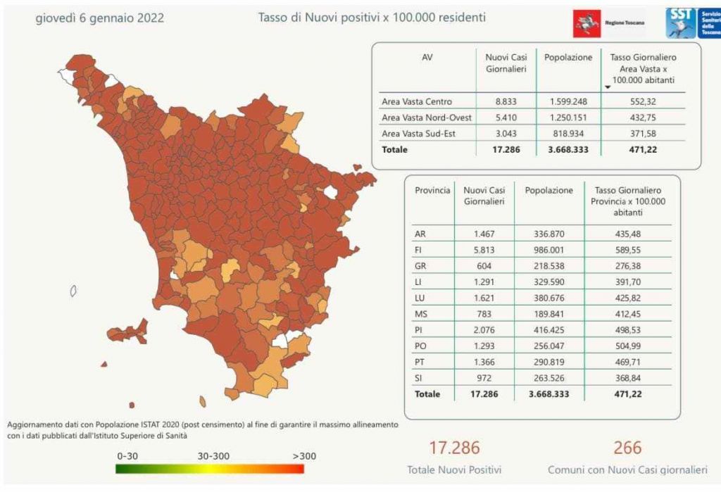I nuovi casi registrati in Toscana sono 17.286 su 75.524 test di cui 22.889 tamponi molecolari e 52.635 test rapidi. Il tasso dei nuovi positivi è 22,89% (75,4% sulle prime diagnosi).