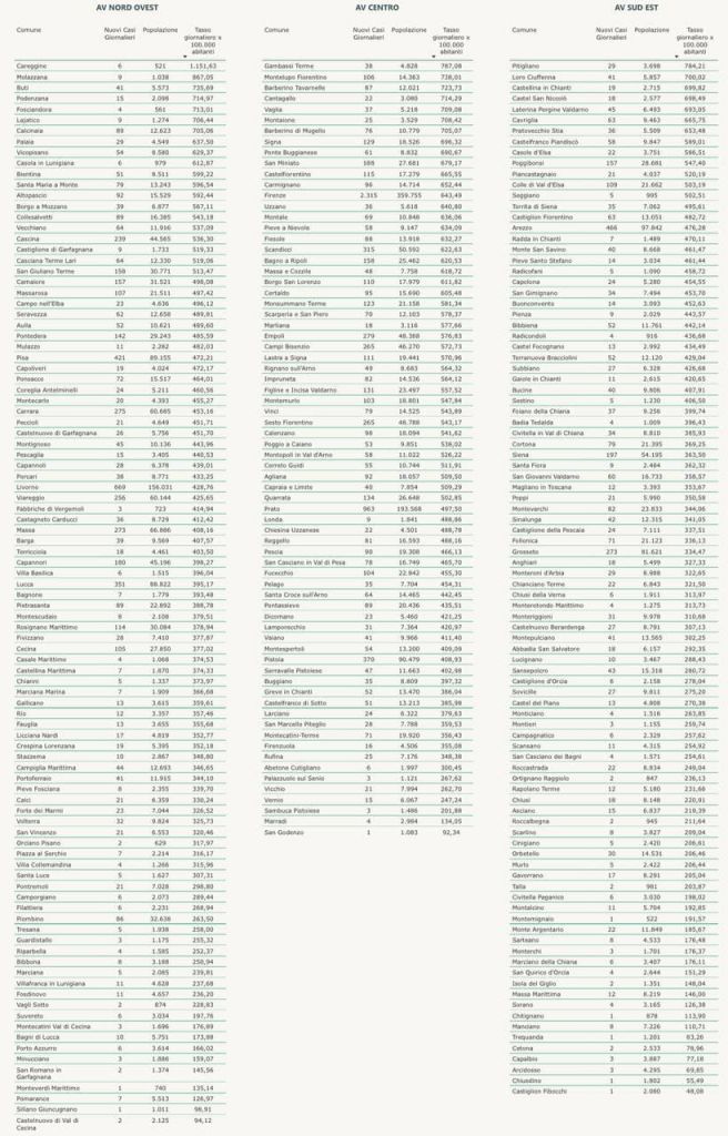 I comuni sono suddivisi per ASL e ordinati in base al tasso di nuovi positivi ogni 100mila abitanti in modo da porre subito l’attenzione delle stesse ASL, ospedali e comuni per i territori che riportano un significativo aumento dei casi.
