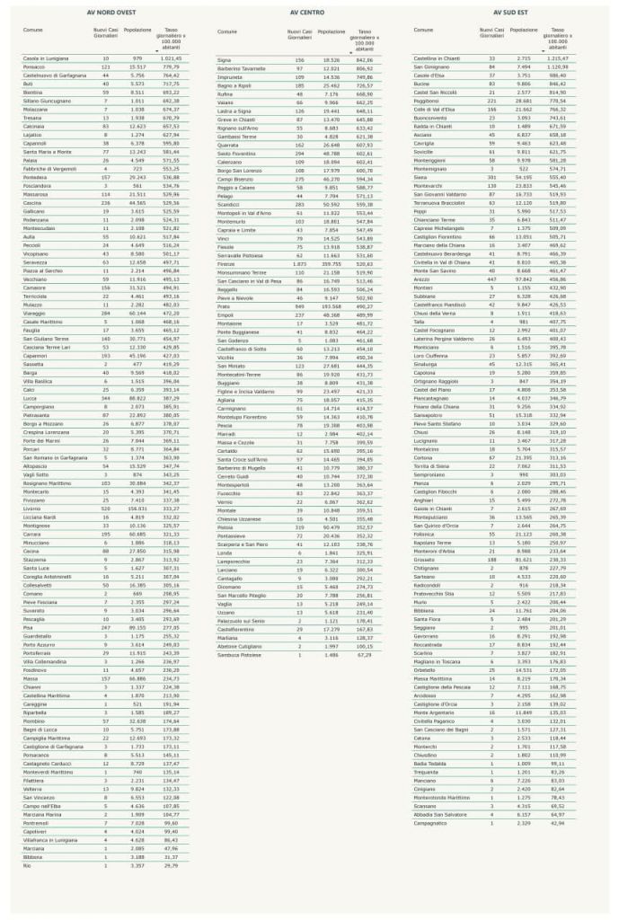 Sono 102.637 i casi complessivi ad oggi a Firenze (5.163 in più rispetto a ieri), 31.458 a Prato (1.268 in più); 33.399 a Pistoia (1.185 in più), 18.609 a Massa-Carrara (553 in più); 36.548 a Lucca (1.616 in più), 41.792 a Pisa (1.852 in più); 27.378 a Livorno (923 in più), 33.467 ad Arezzo (1.490 in più), 23.476 a Siena (1.368 in più), 15.394 a Grosseto (412 in più).