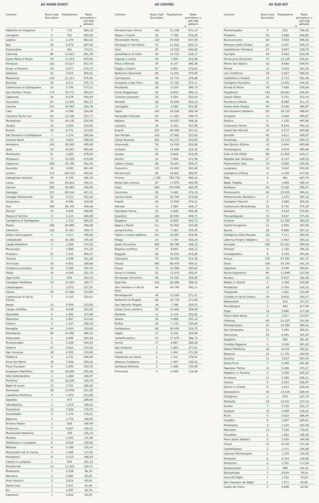 I comuni sono suddivisi per ASL e ordinati in base al tasso di nuovi positivi ogni 100mila abitanti in modo da porre subito l’attenzione delle stesse ASL, ospedali e comuni per i territori che riportano un significativo aumento dei casi.