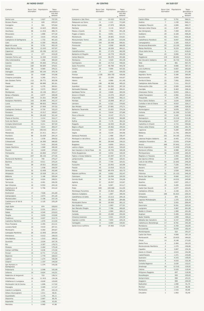 I comuni sono suddivisi per ASL e ordinati in base al tasso di nuovi positivi ogni 100mila abitanti in modo da porre subito l’attenzione delle stesse ASL, ospedali e comuni per i territori che riportano un significativo aumento dei casi.