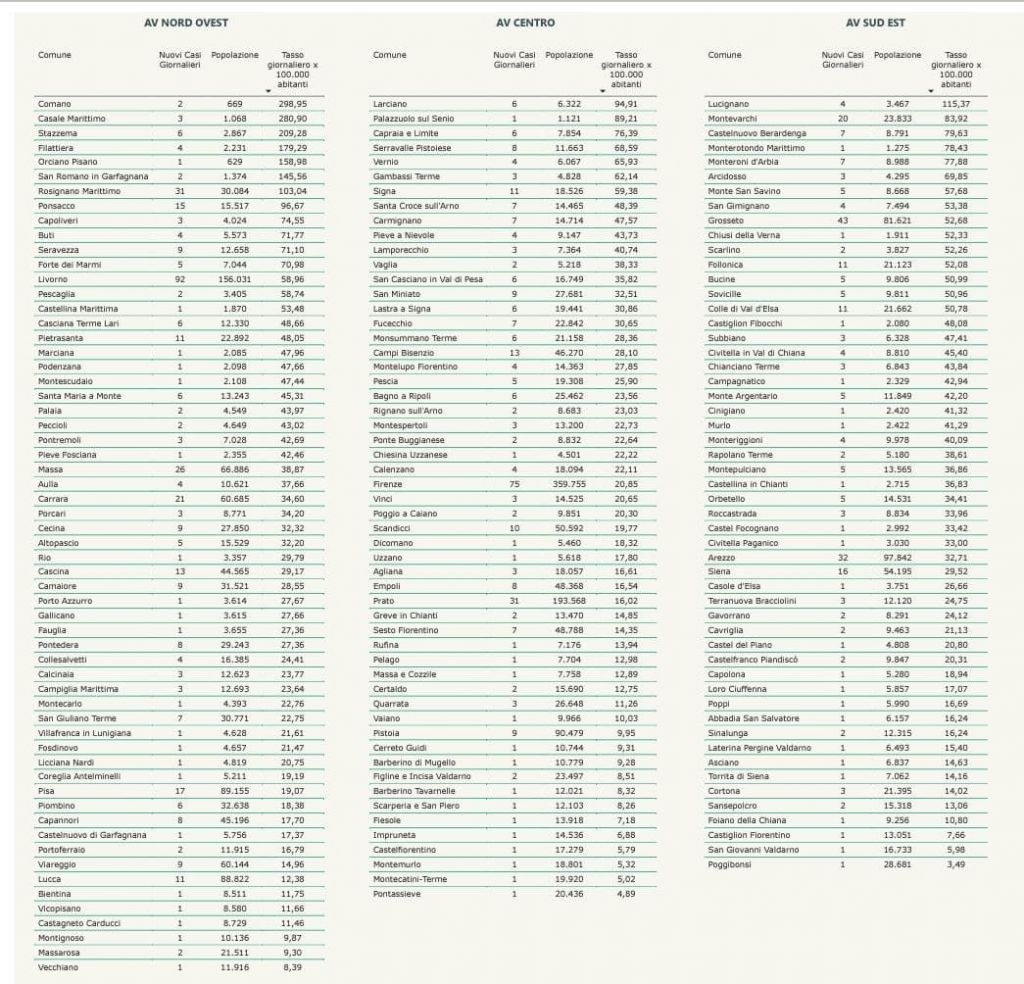 Sono 87.716 i casi complessivi ad oggi a Firenze (297 in più rispetto a ieri), 28.282 a Prato (117 in più); 30.410 a Pistoia (151 in più), 16.813 a Massa (38 in più), 32.220 a Lucca (137 in più), 37.098 a Pisa (135 in più); 24.593 a Livorno (90 in più), 28.795 ad Arezzo (138 in più), 19.272 a Siena (143 in più), 13.861 a Grosseto (70 in più).
