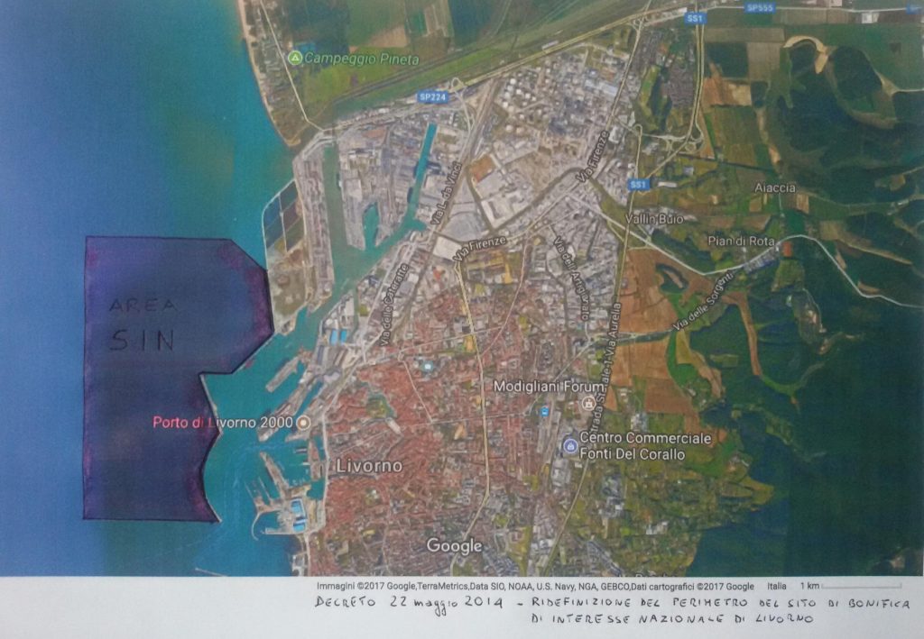 Nella prima cartina riportiamo la situazione attuale, in cui si vede l’area SIN così come identificata dall’attuale normativa: il Decreto del Ministero dell’Ambiente e della Tutela del Territorio e del Mare del 22 maggio 2014, avente per oggetto la “Ridefinizione del perimetro del sito di bonifica di interesse nazionale di Livorno”.