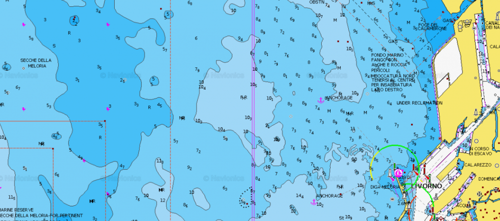 Nella seconda cartina si riportano, invece, le curve batimetriche delle acque antistanti le due vasche di colmata, ad evidenziare come tali condizioni non agevolino neanche la soluzione di utilizzare questo spazio per la realizzazione della “Nuova Darsena Europa”.