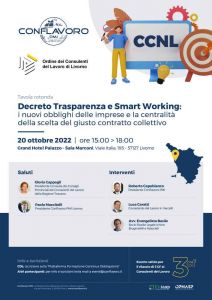 Conflavoro PMI e l’Ordine dei Consulenti del Lavoro di Livorno sono lieti di invitarvi all’evento dal titolo “Decreto Trasparenza e Smart Working: i nuovi obblighi delle imprese e la centralità della scelta del giusto contratto collettivo” che si svolgerà il 20 ottobre 2022 nella sala Marconi del Grand Hotel Palazzo.