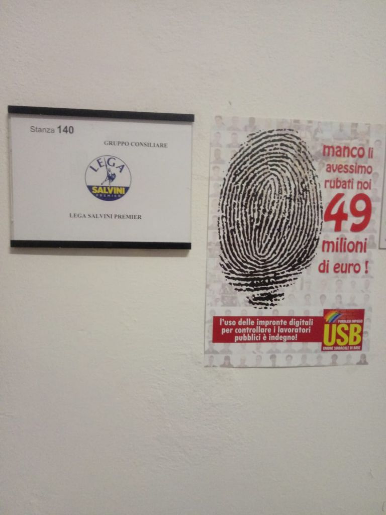 Livorno 13 settembre 2019 – Usb e ” il volantino della discordia”. Dopo le proteste della capogruppo leghista Costanza Vaccaro per il volantino contro le impronte digitali posizionato in Comune e fatto togliere, il sindacato Usb Livorno aveva annunciato che lo avrebbe rimesso e lo ha fatto veramente posizionandolo all’ingresso della stanza del gruppo consiliare della Lega.