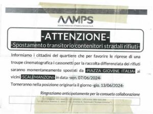 Dopo Straborgo (31/5 – 2/6) dal 7 al 12 di Giugno le riprese di un film nella piazza richiesero lo spostamento dei cassonetti dei rifiuti sugli scali Manzoni e ció fu annunciato in modo preciso e capillare dall’apposizione di avvisi su ogni portone da parte di Aamps, nel quale informava della temporaneitá del provvedimento e della ricollocazione il giorno 13 Giugno.