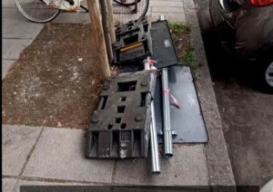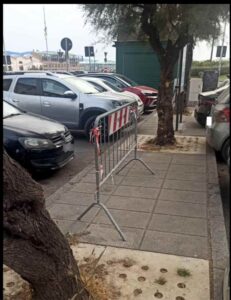 Si aggiunge a tutto questo la presenza nella piazza di due transenne comunali “dimenticate” da un mese, insieme ai cartelli per il divieto di sosta BJ temporaneo per le riprese del film che giacciono adagiati ai piedi di una tamerice.