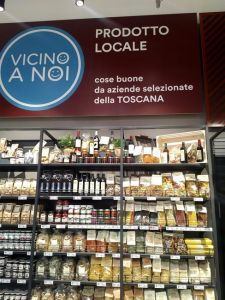 Al centro la valorizzazione dei prodotti toscani e livornesi per rafforzare il legame con il territorio. Alcuni esempi: la produzione interna di pane, schiacce, pizze, torte ecc con l’uso esclusivo di farine da grano toscano; un tipo di formaggio interamente prodotto con latte della Val di Cornia nel Caseificio geotermico S.Martino di Monterotondo M.Mo che utilizza fonti geotermiche nei processi produttivi; il prosciutto Bazzone della Garfagnana e della Valle del Serchio (Presidio Slow Food) e il prosciutto di San Galgano (Chiusdino); il Bovino di Maremma nato, allevato e macellato in loco; il Suino e il Pollo Toscano; le acciughe pescate nel mare tra Piombino e Livorno e consegnate nella prima mattinata alla pescheria del punto vendita; le Orate di Capraia; la frutta e la verdura della Val di Cornia e del territorio toscano.