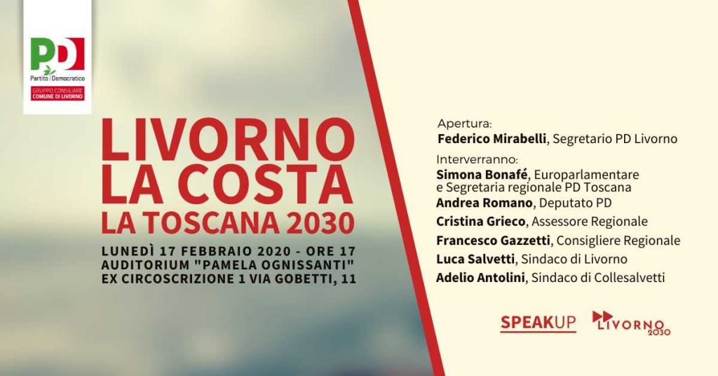 Livorno 16 febbraio 2020 – “Livorno, la costa, la Toscana 2030” è il tema dell’iniziativa promossa dal Partito Democratico di Livorno e dal Gruppo consiliare PD Comune di Livorno che si terrà Lunedì 17 Febbraio alle ore 17 all’Auditorium “Pamela Ognissanti” (ex Circoscrizione 1) in Via Gobetti 11 a Livorno, primo step di verifica e sintesi del programma SpeakUp Livorno 2030.