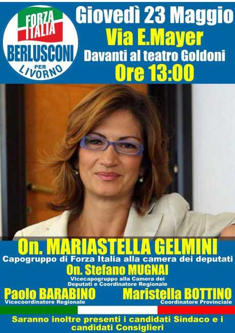 Livorno -L’Onorevole Mariastella Gelmini sarà presente a Livorno domani giovedì 23 maggio, alle ore 13 in via E Mayer (davanti al teatro Goldoni)