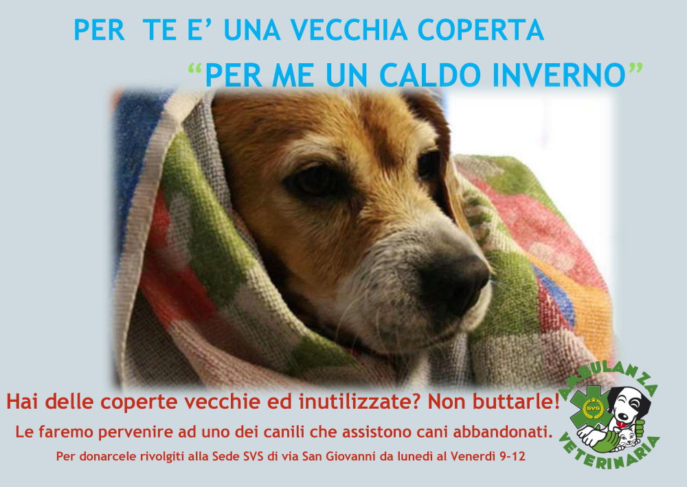 Se hai coperte che non utilizzi più non gettarle, puoi portarle alla sede SVS di via San Giovanni 30 a Livorno, dove i volontari del gruppo Ambulanza Veterinaria provvederanno a consegnarle ai canili e ai gattili della zona.