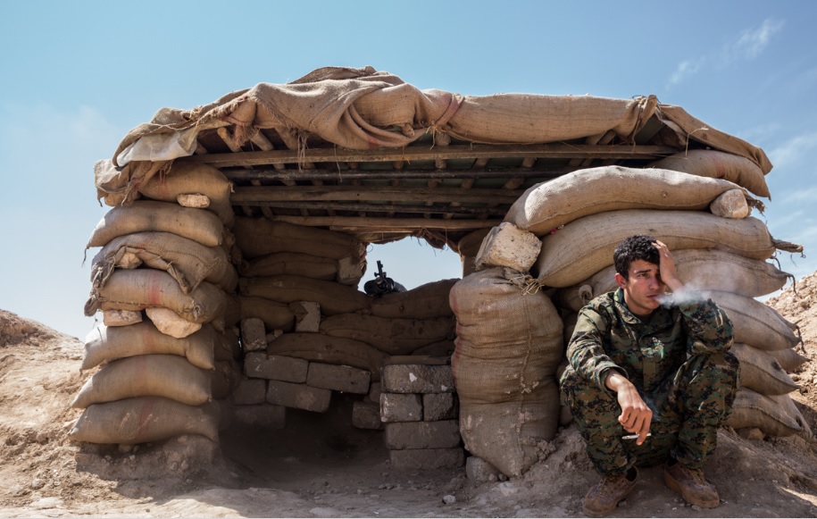 A causa del loro attaccamento a un culto di origine preislamica e gnostica, hanno ricevuto anni di forte repressione. Negli ultimi tre anni gli Ezidi sono stati i principali bersagli della pulizia etnica da miliziani dell’Is, insieme a cristiani e sciiti. Tutti ricordano la loro fuga verso le montagne di Sinjar, quando l’IS iniziò una forte offensiva nel nord dell’Iraq all’inizio di agosto 2014. A quel tempo, le forze IS commettevano un massacro, uccidendo più di 5000 Ezidi e rapendo altre migliaia di donne, vendute in schiavitù Mosul o Raqqa. La popolazione che sopravvisse agli attacchi fuggì nelle montagne intorno a Sinjar dove fu intrappolata senza cibo, acqua o cure mediche, affrontando fame, disidratazione e il rischio di ulteriori incursioni da parte di IS. Fortunatamente il PKK ei suoi alleati locali con forze YPG dalla Siria aprono un corridoio verso le montagne fino a Rojava (Siria settentrionale, guidata dalle forze curde) per farli fuggire in sicurezza. Migliaia di Ezidi sono al sicuro in Rojava o in Anatolia in quel momento. Nonostante ciò oggi più di 35.000 persone vivono ancora nel cuore della montagna all’interno di tende autoportate all’interno di un’area attraversata da continue tensioni. Diverse aree di frontiera contro l’IS attorno a Sinjar sono ancora difese dalle forze alleate locali del PKK di YBŞ, composte da persone Yazidis. In questa foto un giovane combattente Yuz ezidi si rilassa di fronte alla sua posizione di guardia in prima linea contro IS nella periferia di Shengale, durante un momento di calma. Era uno dei combattenti che nell’agosto 2014 ha salvato la vita a migliaia di persone.