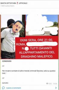 Nel post una foto del presidente del Consiglio Mario Draghi ritratto con i baffetti da Hitler e ammanettato, e la scritta: “Ogni sera ore 21 .. – indirizzo di casa – Tutti davanti all’appartamento del Draghino Malefico”