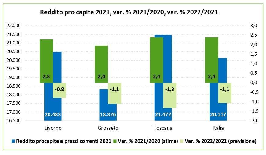 Il reddito pro capite 2021 si stima in crescita ovunq Grosseto (2%), Livorno (2,3%), Toscana ed Italia ( 2,4%)