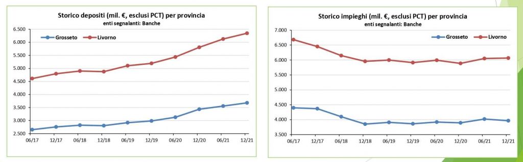 In entrambe le province tale innalzamento è dovuto dai comportamenti volti al risparmio sia delle famiglie (con incrementi attorno al 5%), che rappresentano peraltro la componente ampiamente maggioritaria dei depositi, sia e soprattutto delle imprese con incrementi oltre il 10% e lieve predominanza di quelle di maggiori dimensioni (soprattutto a Livorno),