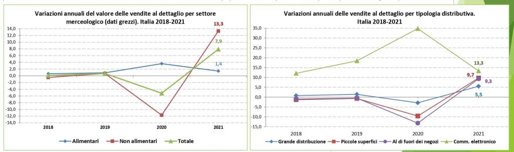 Un discorso a parte merita il commercio elettronico: dopo un 2020 dai numeri eccezionali (dovuti alla “reclusione” forzata), il 2021 si chiude con un più “modesto” +13,3%.
