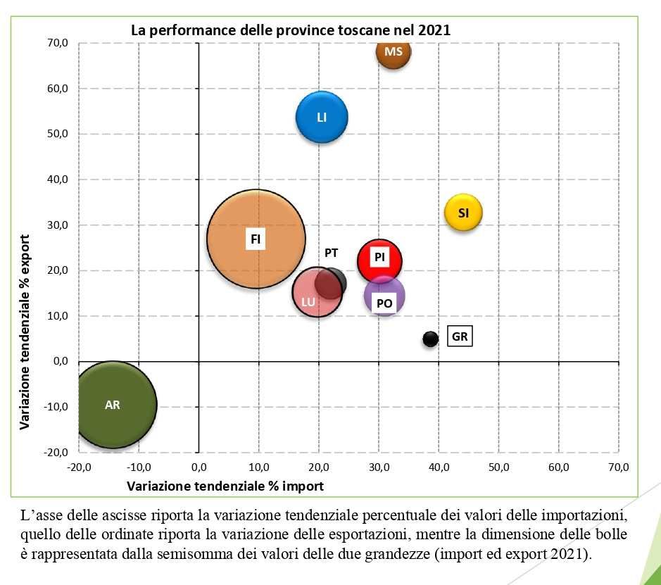 Livorno, territorio con un forte grado di apertura verso l’estero, riesce ad intercettare la ripartenza globale e chiude l’anno con il migliore valore esportato di sempre ma con un valore importato decisamente più basso rispetto al decennio precedente. Grosseto, che poco aveva perso col 2020, mette a segno due variazioni positive, soprattutto in termini di import.