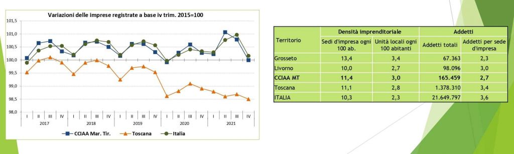 Sono sicuramente più diffuse (sedi d’impresa ogni 100 abitanti) soprattutto perché la Maremma è dotata di un gran numero d’imprese piccole o piccolissime operanti in agricoltura ma ha una densità abitativa fra le più basse d’Italia.