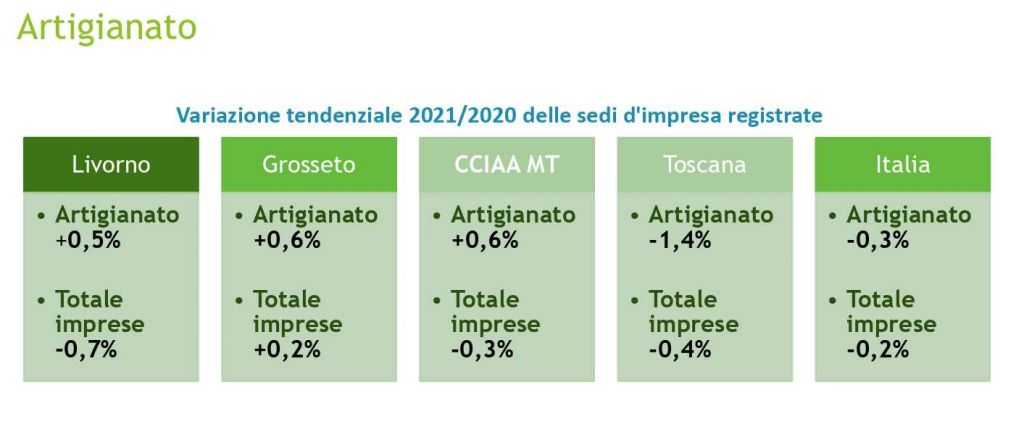 Il grado di artigianalità del tessuto economico di Grosseto (19,8%) e Livorno (21,7%) è sostanzialmente in linea con la media nazionale (21,2%) ma resta ancora al di sotto della media regionale (24,8%).