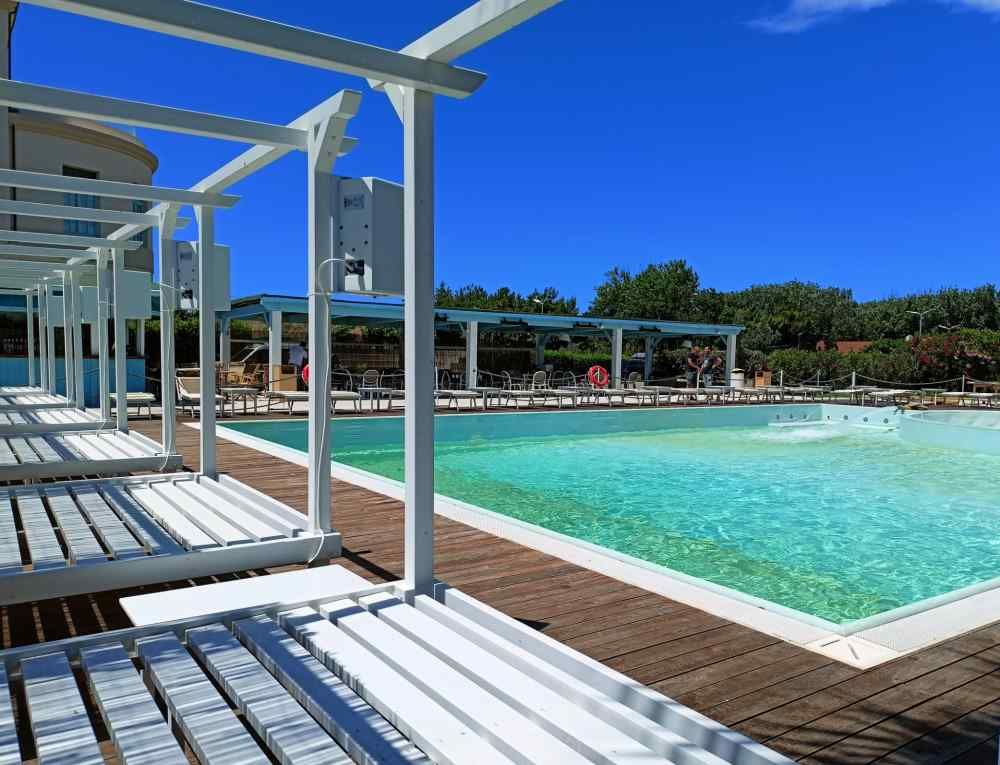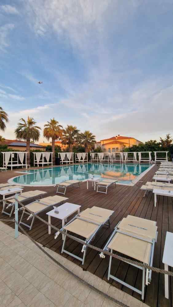 Sole, tintarella e bagni in piscina in un ambiente con lettini a baldacchino, dj set, animazione diurna e serale fino alla mezzanotte ed un chiosco per cibo fornito da Dark Kitchen (in via Cairoli a Livorno) e gli immancabili drink a bordo piscina