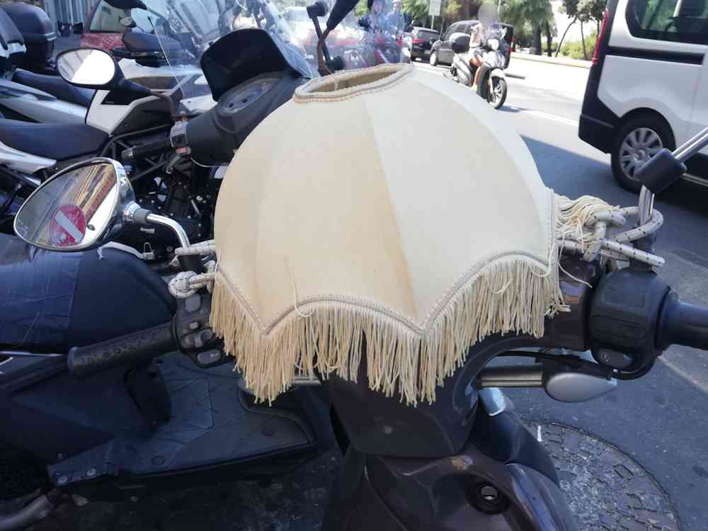 Ecco la storia: uno scooterista livornese ha utilizzato un paralume di una lampada da comodino – di tela e struttura metallica – ormai rotto. Lo ha pulito, posizionato sopra il cruscotto e fissato con una corda agli specchietti; è resistente al vento, totalmente rimovibile e riponibile nel vano sottosella. Quando si parcheggia si fissa, lo si ripone quando si riparte. Una trovata low-cost che risolve il problema dell’esposizione solare in modo pratico e… decisamente creativo.