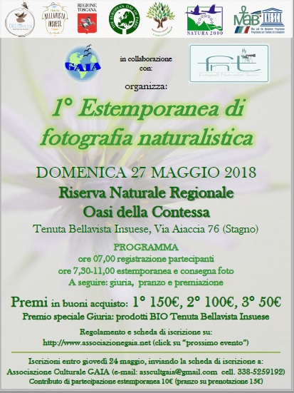 Domenica 27/5 il gran finale con la 1ª Estemporanea di Fotografia Naturalistica, aperta a tutti i fotografi appassionati di natura, organizzata in collaborazione con l’Associazione Fotografi Naturalisti Toscani, con premi in buoni acquisto fotografici e premio speciale giuria in prodotti BIO, gentilmente offerto dalla Proprietà Tenuta Bellavista Insuese.