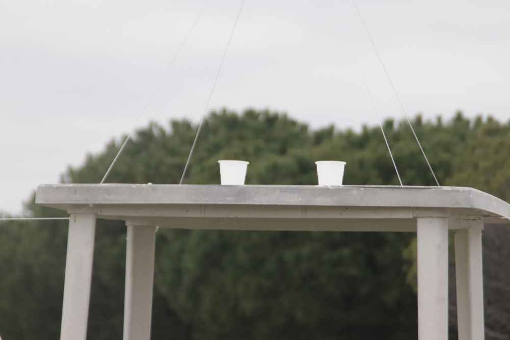 Chi passa dalla zona può vedere sospesi a mezz’aria e legate all’intelaiatura del cartellone per la pubblicità stradale due sedie e un tavolo con sopra due bicchieri ti plastica sospesi a mezz’aria.