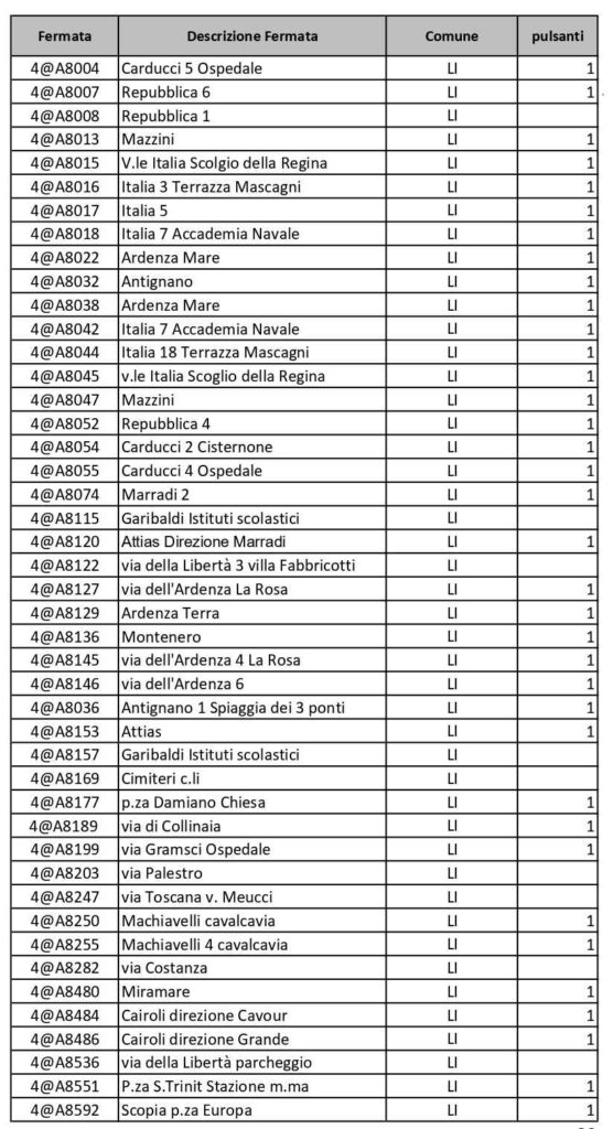 Al termine dell’articolo l’elenco completo delle fermate, quelle con il numero 1 sono le fermate dove i pulsanti sono già installati