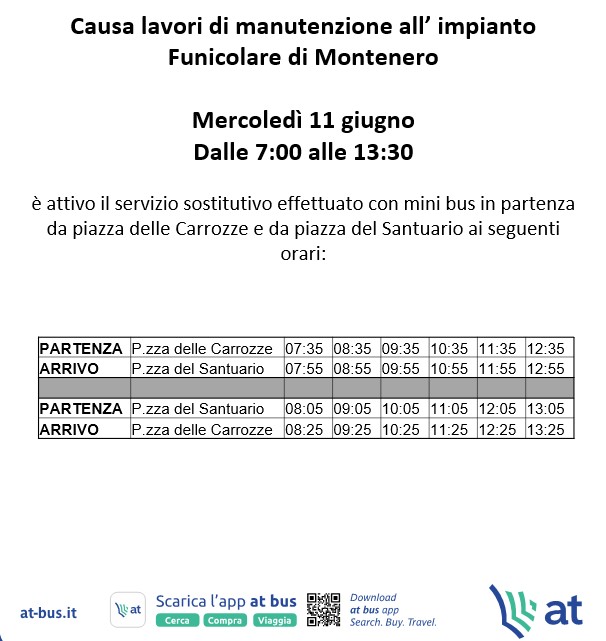 AT-autolinee toscane informa che domani, 11 giugno 2025, dalle ore 07:00 alle ore 13:00 la funicolare di Montenero Livorno subirà un fermo tecnico per lavori di manutenzione, ma il percorso sarà comunque garantito da un servizio navetta bus sostitutivi di at-autolinee toscane.