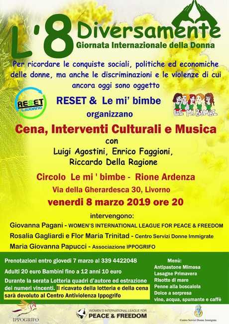 Una cena diversa, per festeggiare tutti insieme le donne con cibo squisito e tanta buona musica che si terrà venerdì 8 marzo 2019 ore 20 presso il circolo Arci “Le mi bimbe” Rione Ardenza, in Via della Gherardesca 30 a Livorno.