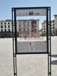 Alla presenza del sindaco Luca Salvetti e della vicesindaca Libera Camici è stato svelato il primo dei due pannelli realizzati, che sovrappone ad uno dei palazzi di Piazza della Repubblica una foto storica che lo ritrae poco dopo i bombardamenti della Seconda Guerra Mondiale.